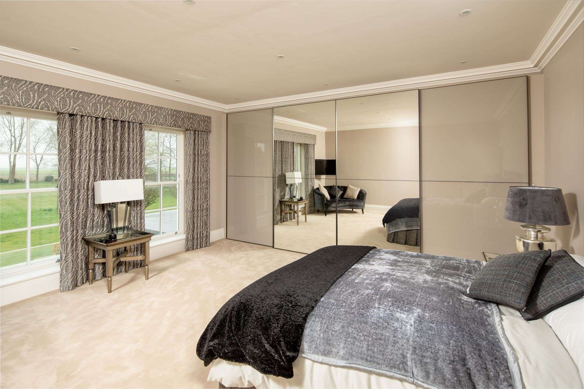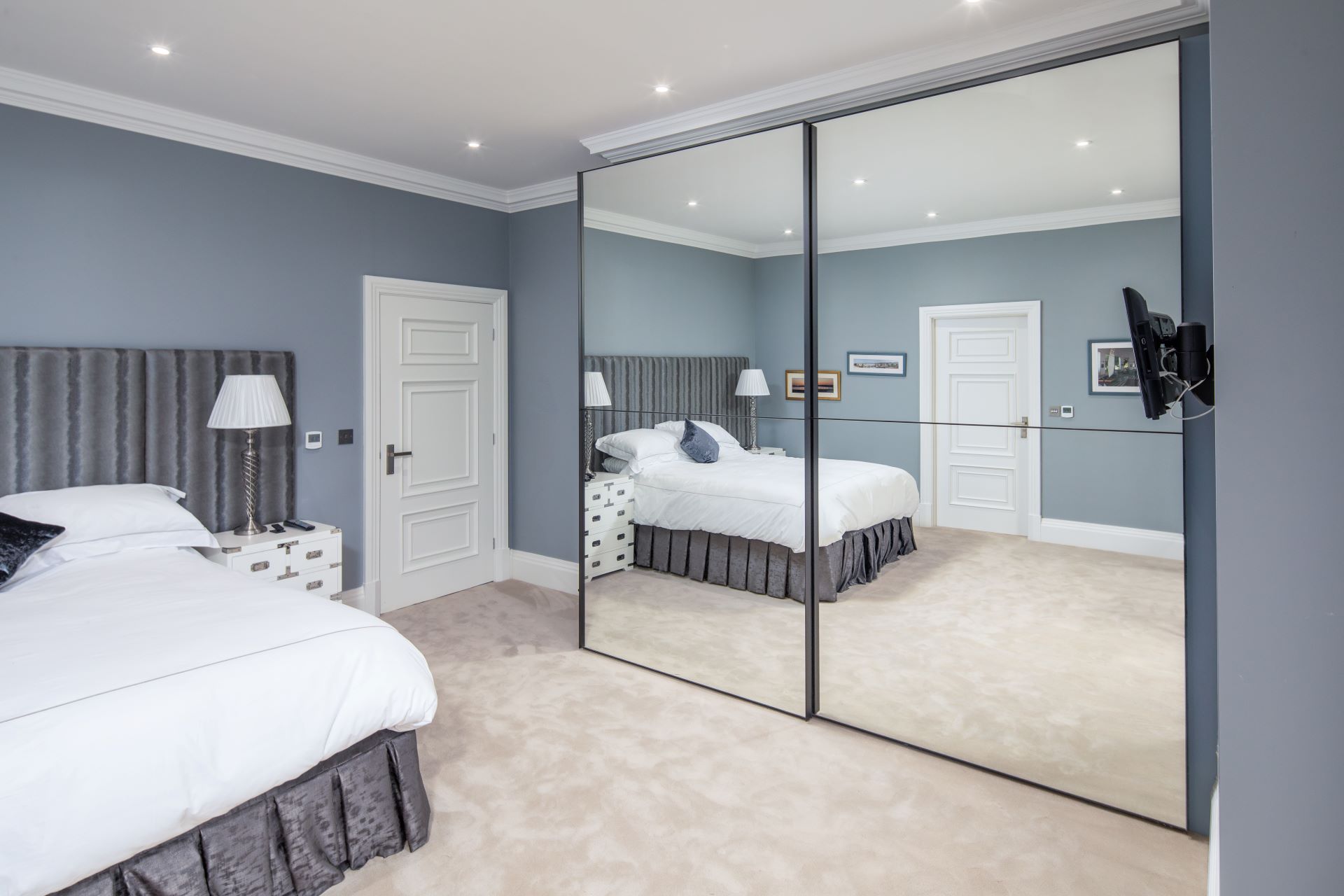 Knottingley Bedroom with Sophisticated Wardrobes combining Colored Glass and Mirror